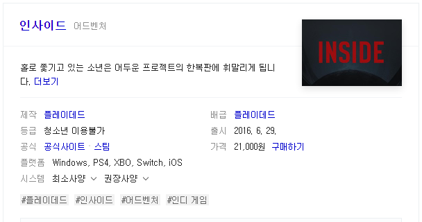 게임 초반을 무료로 플레이하세요. 앱 내에서 전체 게임을 구매할 수 있습니다. iPhone 6S, iPad Air 2, Apple TV 이상 버전과 호환. 2018 Apple Design Award Winner “MASTERPIECE! Inside is a 2D puzzle platformer that builds upon what made Limbo great, and in fact builds something greater.” 10/10 – IGN